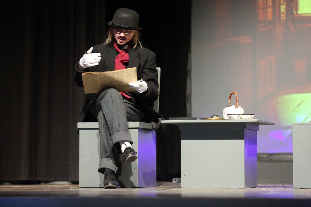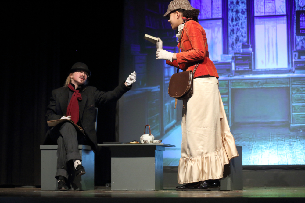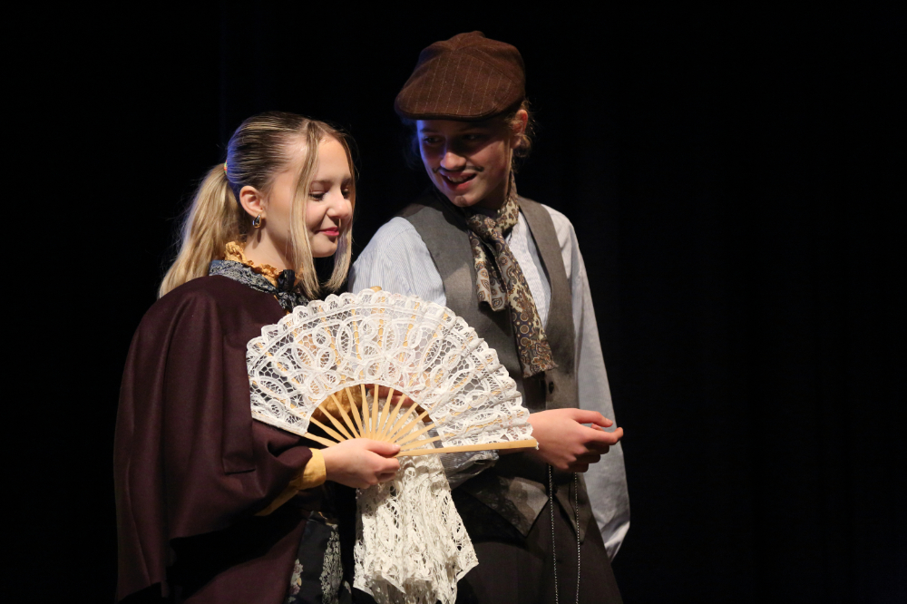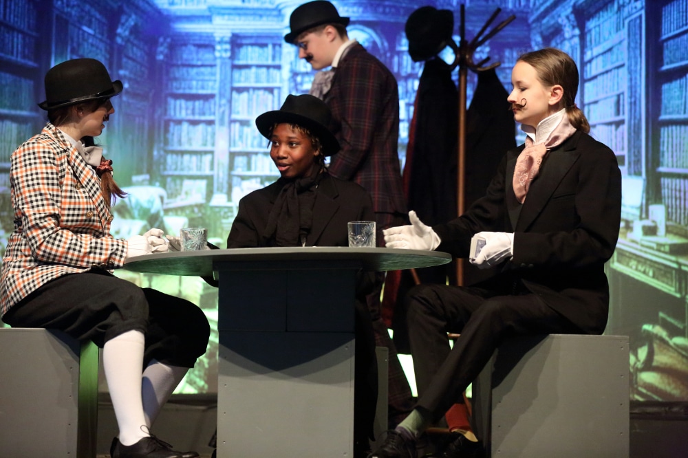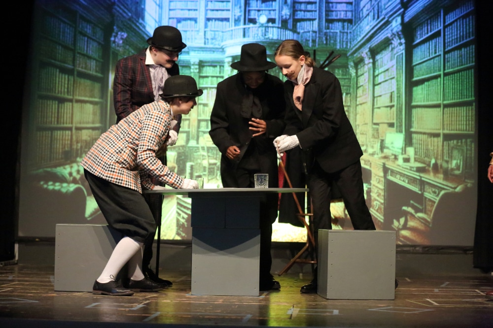 Tolle Bühnenbilder stellen die verschiedenen Transportmittel dar, die die beiden im Laufe der Zeit und des Stücks benutzen werden, da ist der noch vornehme englische Zug über Paris nach Brindisi, das Dampfschiff nach Bombay oder die schlichte Variante des Zuges nach Kalkutta, alle Szenen erhalten ihre eigene farbige Atmosphäre. Schnelle, lebendige Dialoge der Schülerinnen und Schüler der 8. Klasse versprühen Witz und Charme und so schließt man die Protagonisten als Zuschauer genau so ins Herz, wie das die beiden gegenseitig im Laufe der Reise tun. Bei aller Unterschiedlichkeit – „Neutral sein gegenüber Frauen?“ für Passepartout undenkbar, für Fogg eine Haltung – wachsen sie zusammen. Gut so, denn sie haben so manches Abenteuer zu meistern!